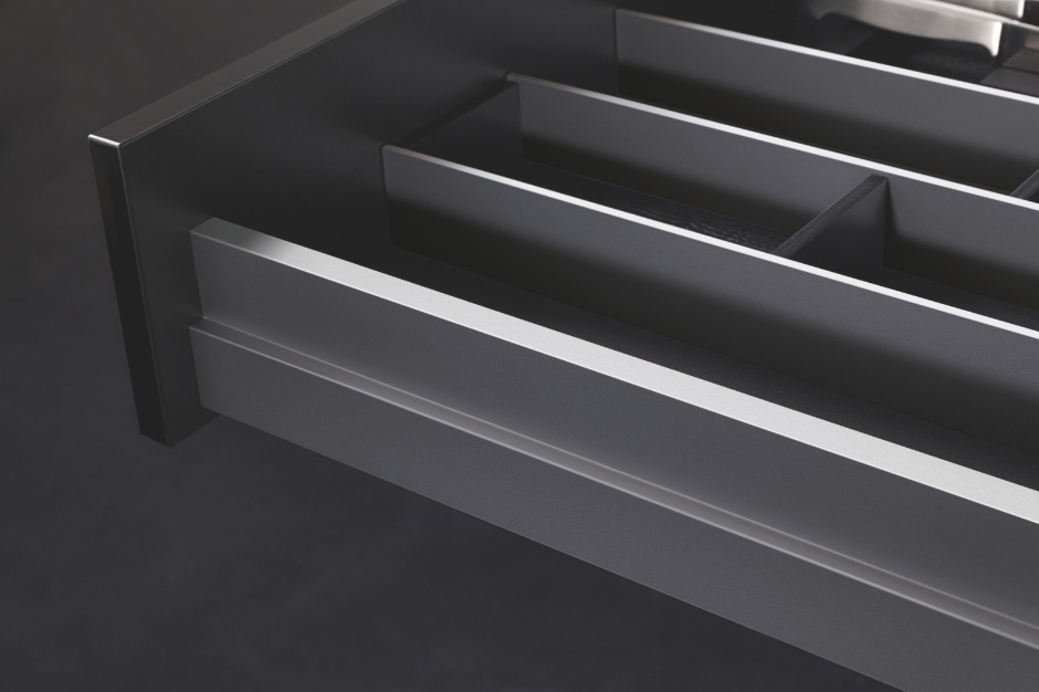 The puristic design with its striking lines, right angles and small radii gives the double wall metal drawer sides a timeless, technical and functional look. The special character of Nova Pro is hallmarked by its perfection down to the last detail and the modular system concept.