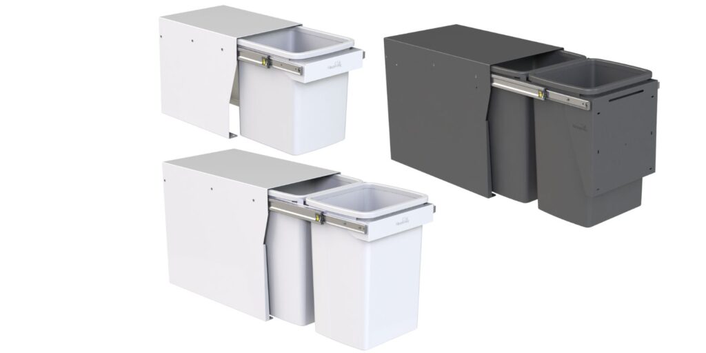 The extensive range is available in two sophisticated colour options: Arctic White and Cinder, ensuring seamless integration into various cabinetry designs. Bucket configurations include 1 x 15L, 1 x 20L, 2 x 15L, and 2 x 20L. Twin bin options enable convenient waste separation, while single bucket solutions are perfect for accommodating cabinets with plumbing or other appliances. The range offers both handle pull options and, for twin bin solutions, a convenient door pull design.