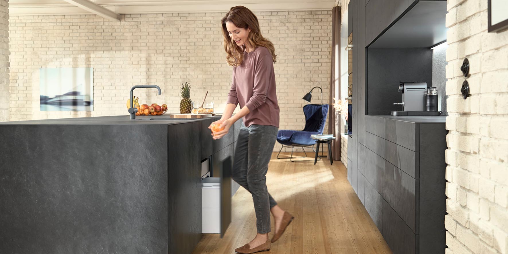 This integrated system truly shines in its compatibility with Blum’s push-to-open technology, creating a fully hands-free disposal experience. A gentle push activates the Legrabox drawer, while Concelo’s Active Lid drops seamlessly over the bins, trapping in odour and moisture without the need for manual intervention. This intelligent design means no fumbling with bin lids and no lingering smells – just elegant waste management that works in rhythm with the kitchen.