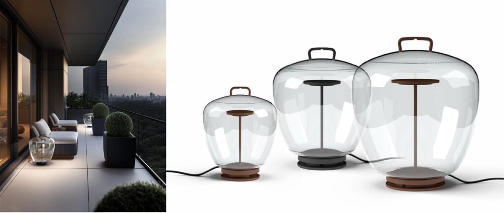 Rolling Sky Lantern (above): Rolling Sky is a collection of outdoor lamps characterised by organic and elegant shapes. The light projected onto the surface creates unique effects, transforming outdoor spaces into evocative and welcoming environments. The transparency of the PMMA diffuser allows for homogeneous light distribution, offering strength, durability and unparalleled visual comfort. Versatility is built into the range by allowing the diffusers (both round and amphora) to be combined with the light units in a variety of ways which allow the light to be customised and adapted to the needs of the project. Rolling Sky Lantern is equipped with an amphora-shaped diffuser, Shuko plug and a convenient handle to move it easily from one place to another. Ideal for gardens, terraces and designer outdoor environments.