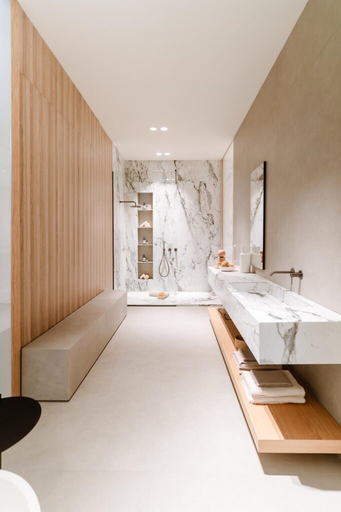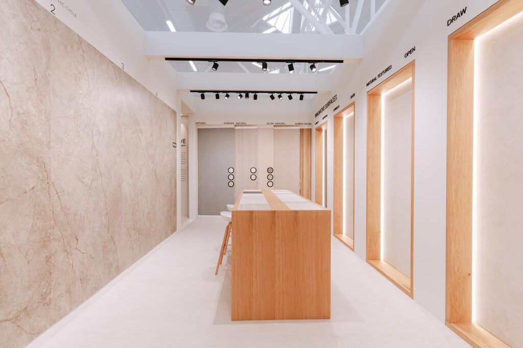 The company’s stand was defined by essential architectural forms, fluid volumes and open spaces that embraced a range of materials, colours and functions. The idea was to showcase technical precision where it meets the material essence of the surface. Oversized slabs took centre stage, showcasing the versatility of application through floors, walls, facades and furniture, with a focus on contemporary style and design.